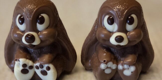 Alle unsere Osterhasen werden mit viel Liebe, Sorgfalt und Herzblut hergestellt. Von der leeren Schokoladenform, bis hin zum fertig eingepackten Hasen alles Handarbeit! Die Hasen stehen alle bereit um vernascht zu werden.